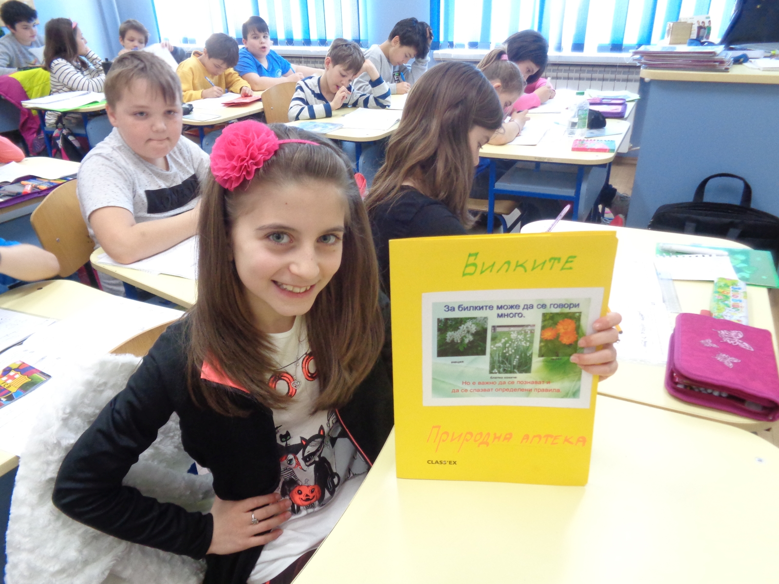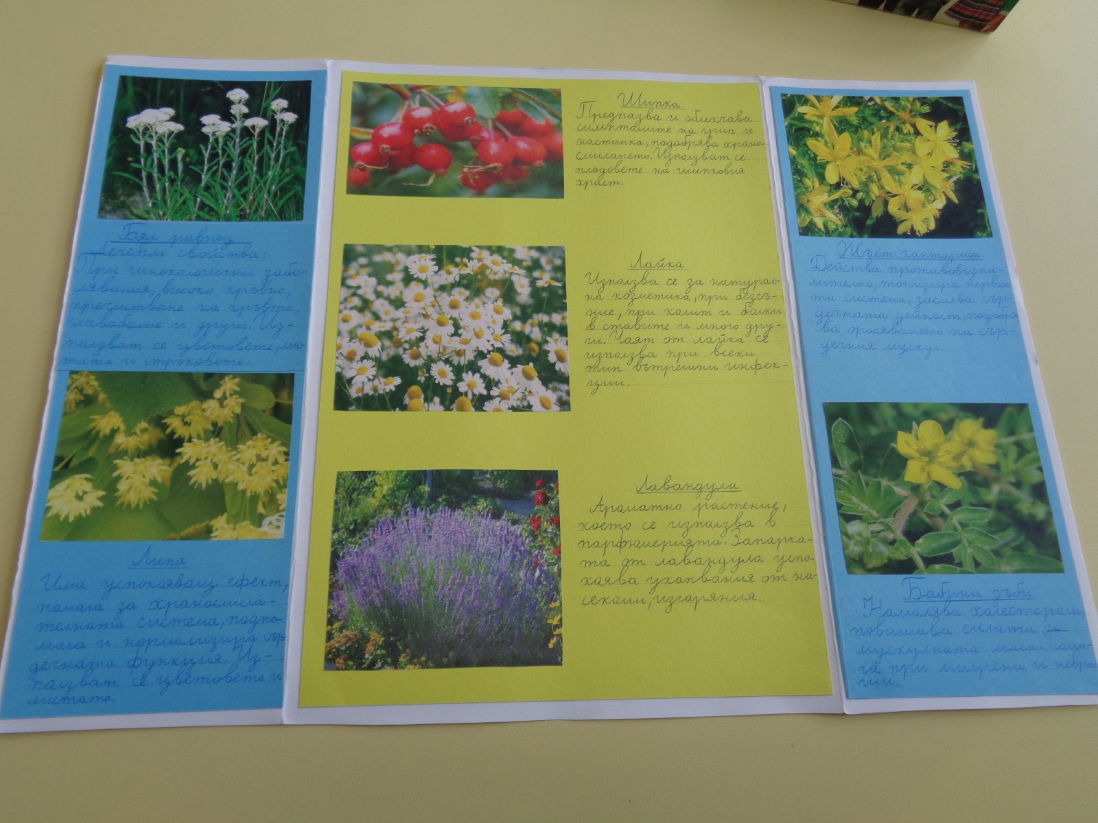 На учениците се възложи самостоятелно да проучат голямото им разнообразие в България и техните лечебни свойства и приложение. Така те създадоха своите пъстри лапбуци на тема „Природна аптека“. С голямо удоволствие всеки от тях ги представи пред класа. На децата беше интересно да разберат как могат да бъдат здрави, ако имат правилно отношение към растенията с лековити качества, кога и как да ги берат и да ги опазват.